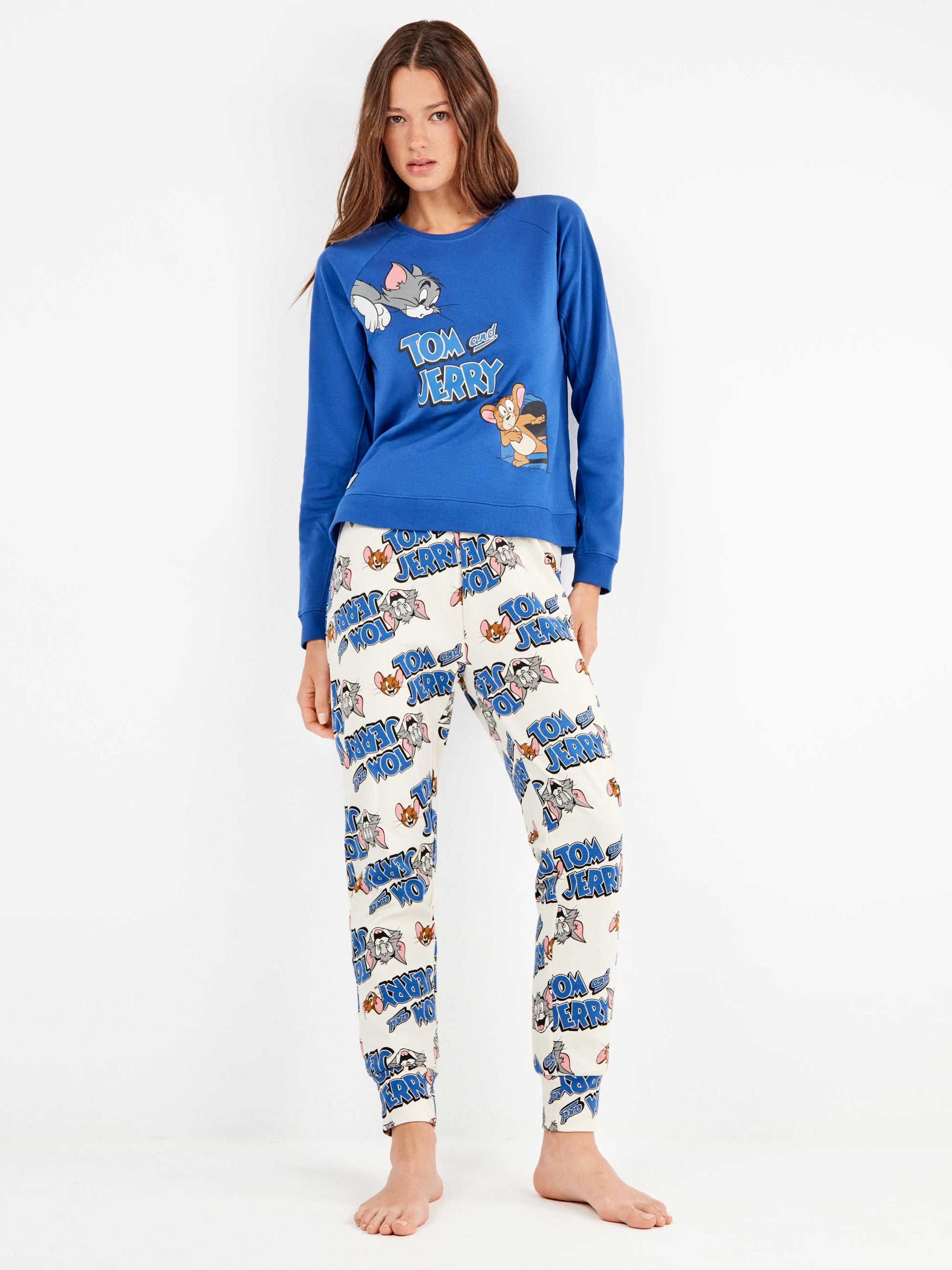 Πιτζάμα με σχέδιο τους ήρωες Tom & Jerry στην μπλούζα. Έχει φαρδιά άνετη γραμμή, με στρόγγυλο λαιμό και ριπ ύφασμα στη μέση και στις μανσέτες. Μαλακό εσωτερικό λάστιχο στο παντελόνι και κορδόνι που ρυθμίζεται. Οι φιγούρες είναι σε όλη την επιφάνεια του παντελονιού. Μπάσκα στο τελείωμα.