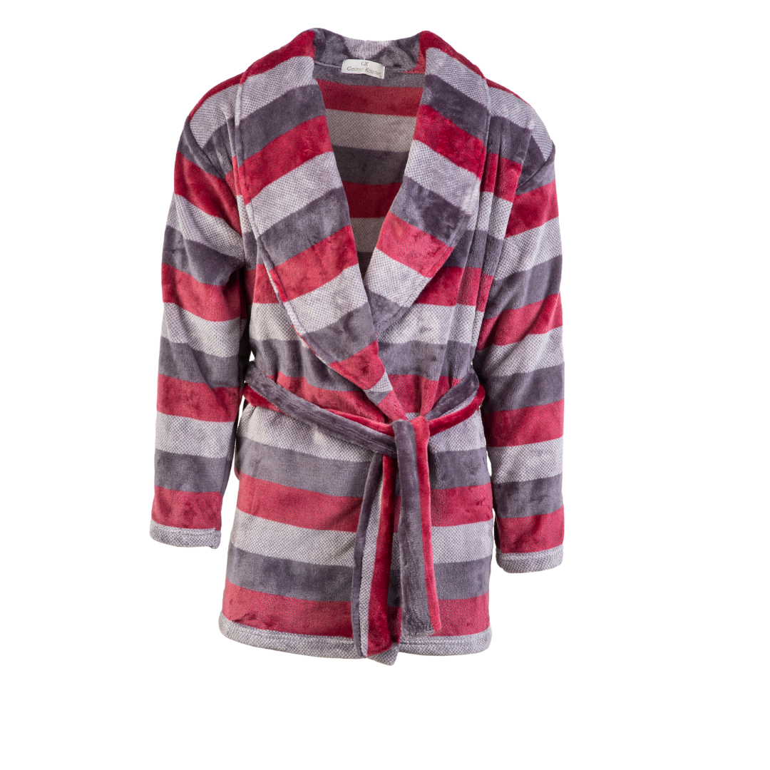 Ανδρική ρόμπα fleece, ζεστή και απαλή, με πέτο γιακά και ζώνη που δένει στη μέση. Είναι τύπου σακάκι με μάκρος που καλύπτει τους γοφούς.