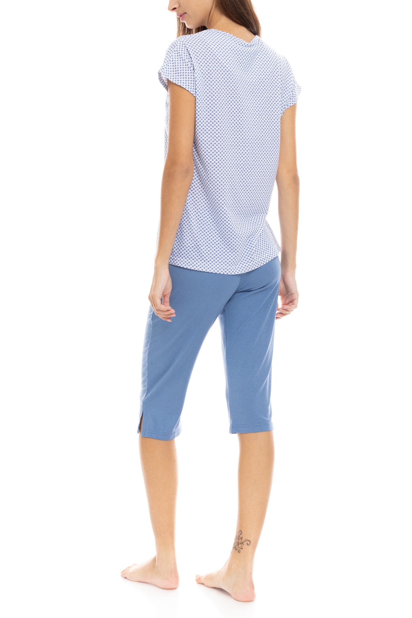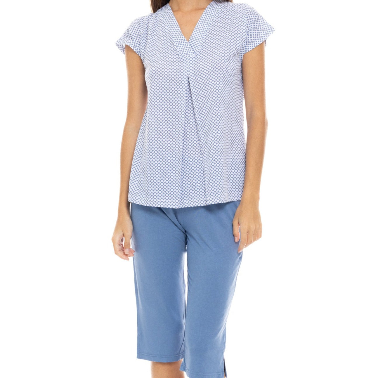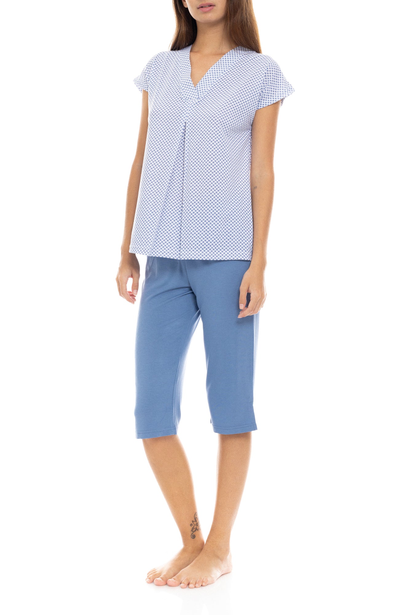Δροσερή και άνετη πιτζάμα με κάπρι παντελόνι και μπλούζα με ρεγκλάν μανίκια. Έχει V λαιμό και πιέτα κάτω από το στήθος για μεγαλύτερη άνεση στην περιοχή της κοιλιάς. Το παντελόνι έχει μαλακό εσωτερικό λάστιχο στη μέση και κανονικό ύψος καβάλου.