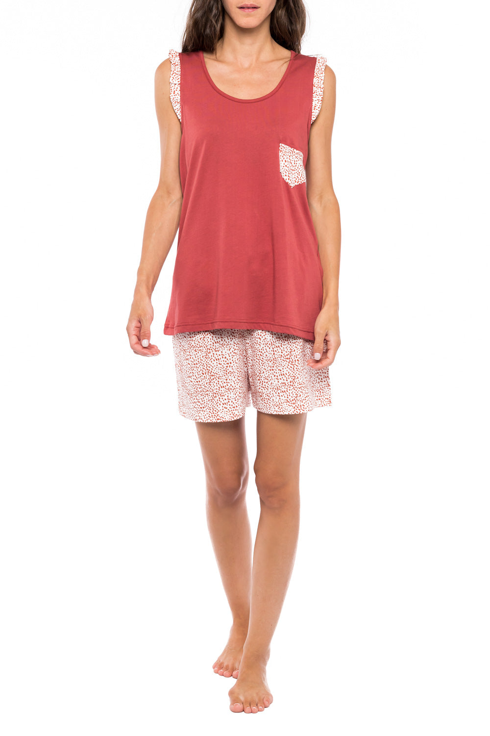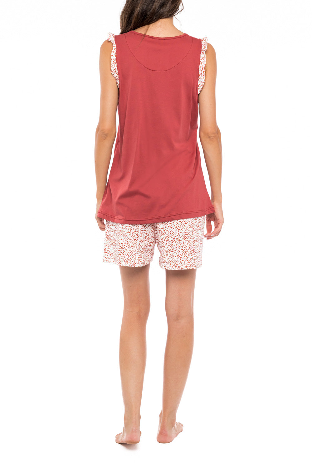 Δροσερή πιτζάμα από 100% βαμβάκι. Η μπλούζα είναι μονόχρωμη με χαμηλή λαιμόκοψη, φαρδιά τιράντα και λεπτομέρειες βολάν. Το παντελόνι έχει μαλακό εσωτερικό λάστιχο στη μέση και το ύφασμα είναι με μικρά λουλούδια, σε στυλ βερμούδας.