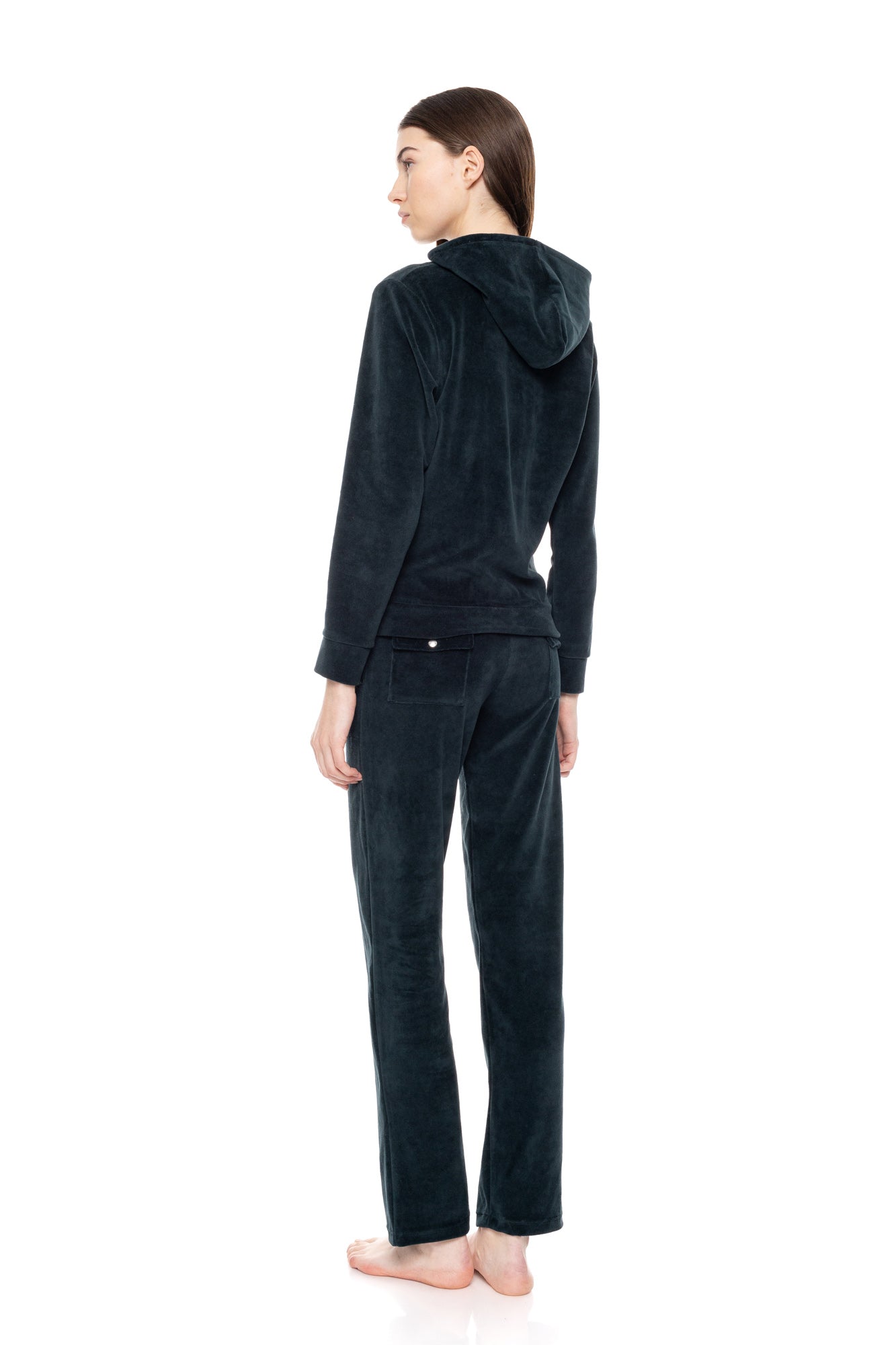 Βελούδινη φόρμα με τσέπες στην ζακέτα, κουκούλα και λάστιχο στις μανσέτες και στο τελείωμα της. Το παντελόνι έχει φαρδύ εσωτερικό λάστιχο στη μέση, τσέπες μπροστά και πίσω, σε ίσια γραμμή. Το ύψος του καβάλου είναι κανονικό προς το ψηλό.