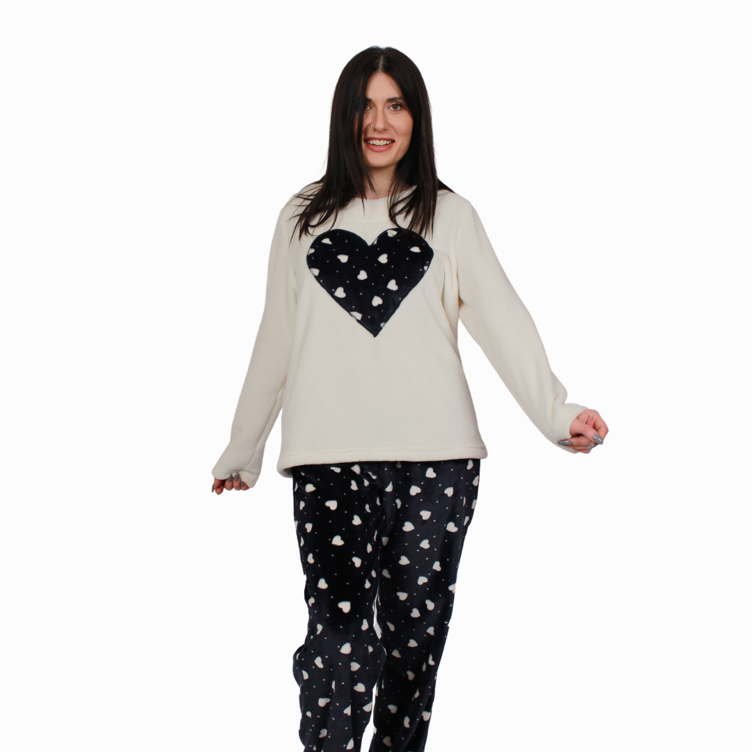 Απαλή και ζεστή fleece πιτζάμα με σχέδιο καρδιά στην μπλούζα και στο παντελόνι. Έχει χαλαρό στρόγγυλο λαιμό και άνετη γραμμή. Το παντελόνι έχει μαλακό εσωτερικό λάστιχο στη μέση και ψηλό καβάλο. Είναι άνετο και σε ίσια γραμμή.