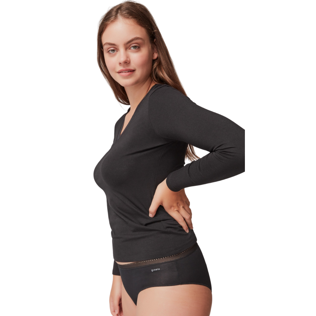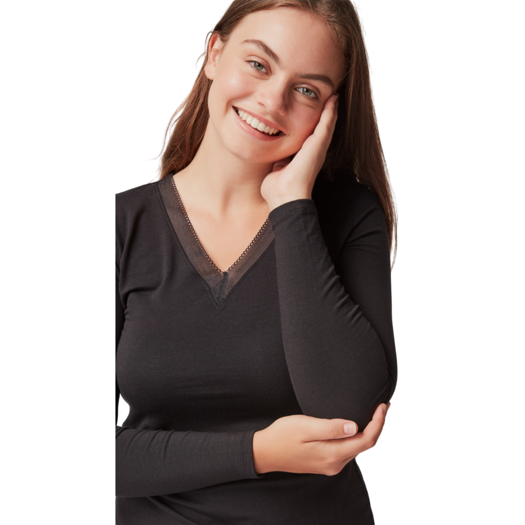 Μακρυμάνικο θερμικό εσώρουχο από ύφασμα Eko Modal Lenzing, ένα πολύ μαλακό υλικό που προέρχεται από ξύλο οξιάς από δάση με βιώσιμη διαχείριση. Αυτό το θερμικό μπλουζάκι διατηρεί τη θερμότητα του σώματος και σέβεται την εφίδρωση του δέρματος. Δαντελωτή λεπτομέρεια στη λαιμόκοψη.