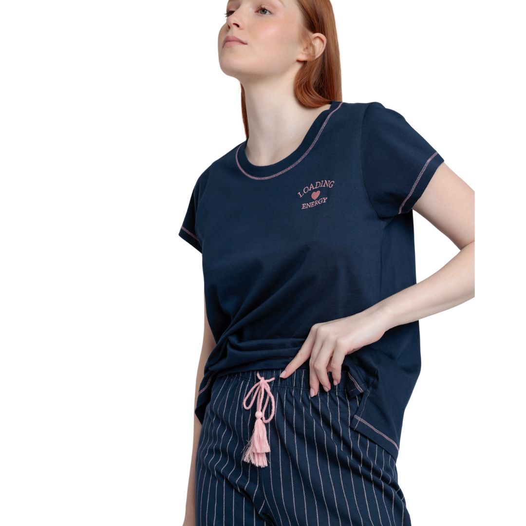 Βαμβακερή πιτζάμα με κοντό μανίκι, στρόγγυλο λαιμό και διακριτικό κέντημα. Το παντελόνι είναι κάτω από το γόνατο με διακριτική ρίγα. Έχει εσωτερικό λάστιχο στη μέση με κορδόνι ροζ που ρυθμίζεται.