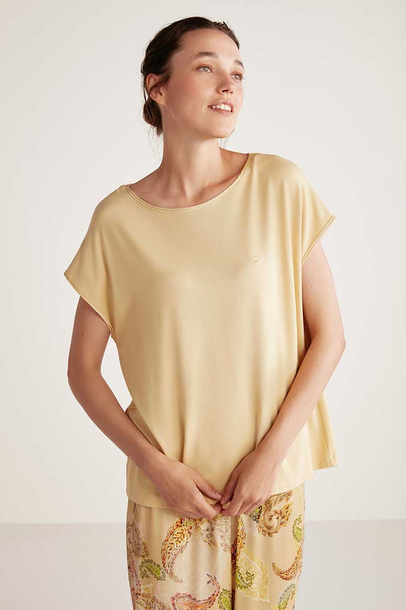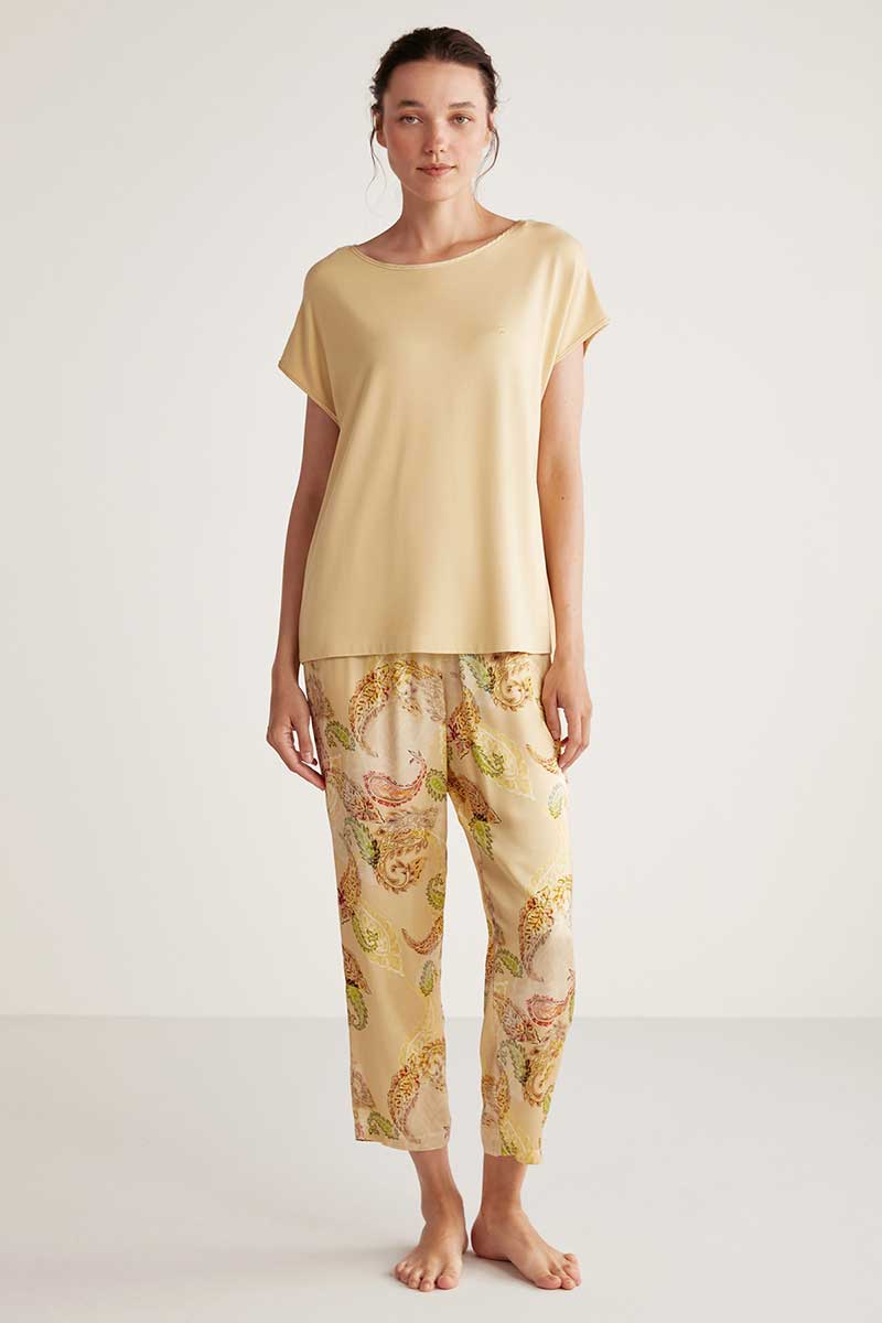 Καλοκαιρινή πιτζάμα με κοντό μανίκι και μακρύ παντελόνι. Η μπλούζα είναι τύπου t-shirt με ρεγκλάν μανίκι και διακριτικό κέντημα. Έχει χαμόγελο λαιμό στολισμένο με μικρό σατέν σιρίτι. Το παντελόνι έχει φαρδύ εσωτερικό λάστιχο στη μέση και φαρδιά ίσια γραμμή, με μάκρος που φτάνει ως τον αστράγαλο. Κατασκευασμένο από 100%viscose σταθερό και δροσερό ύφασμα.