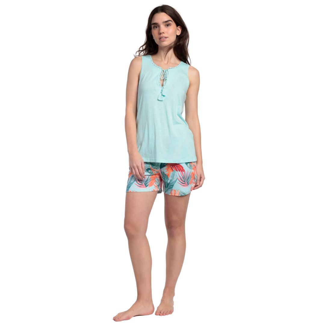 Άνετη και δροσερή καλοκαιρινή πιτζάμα. Αποτελείται από μονόχρωμη μπλούζα με φαρδιά τιράντα και διακριτικό άνοιγμα στο ντεκολτέ, στολισμένη με κορδόνι. Το παντελόνι είναι κοντό, floral με μαλακό εσωτερικό λάστιχο στη μέση και κανονικό ύψος καβάλου.
