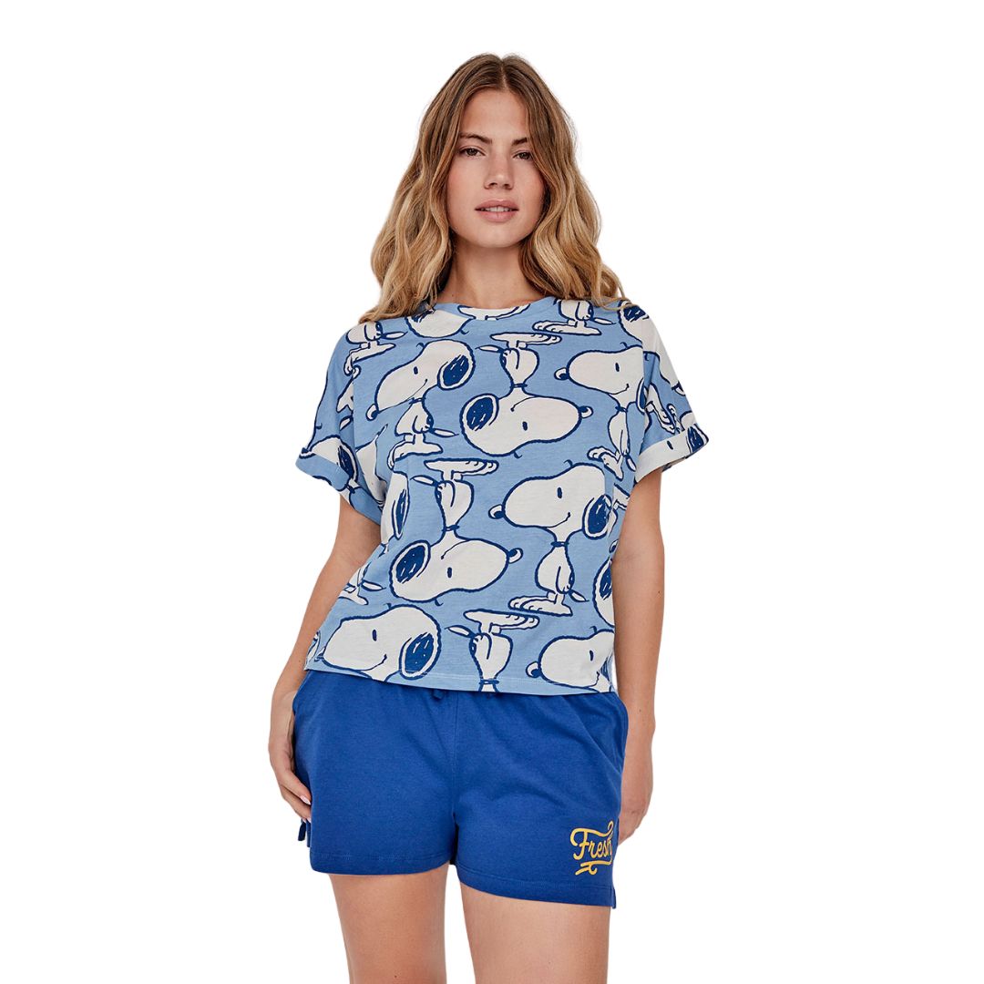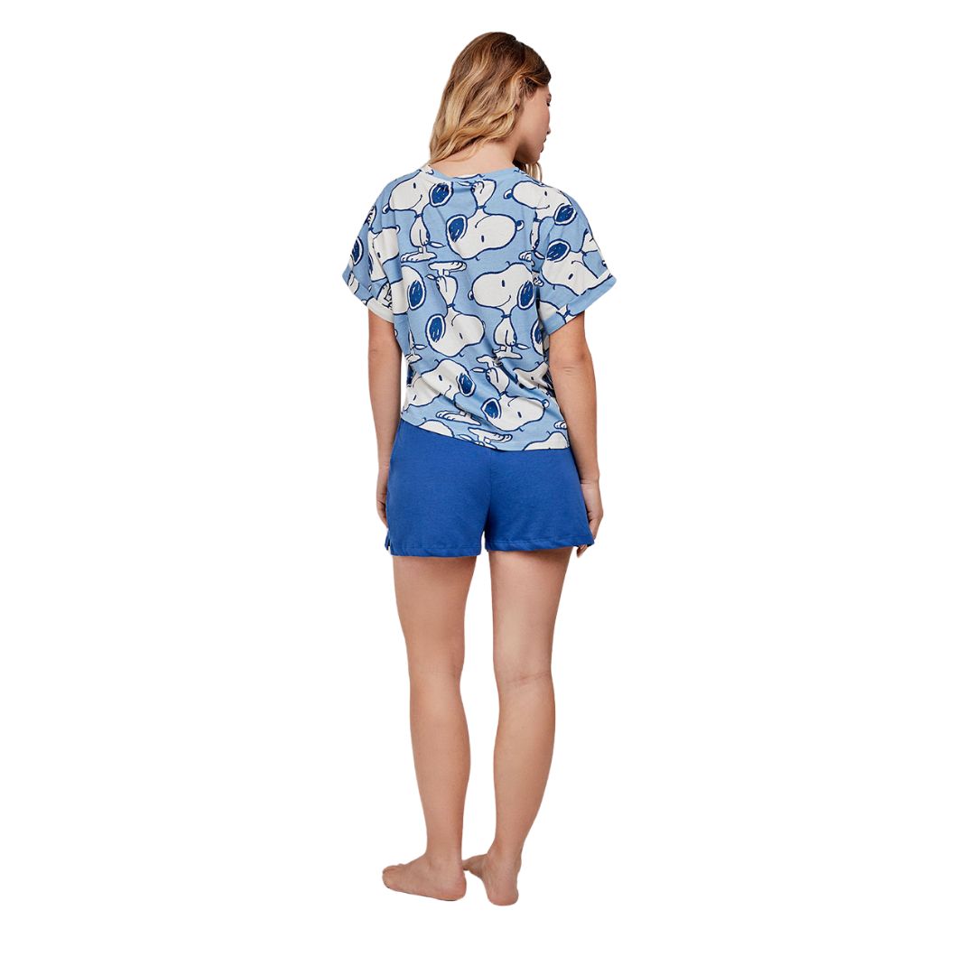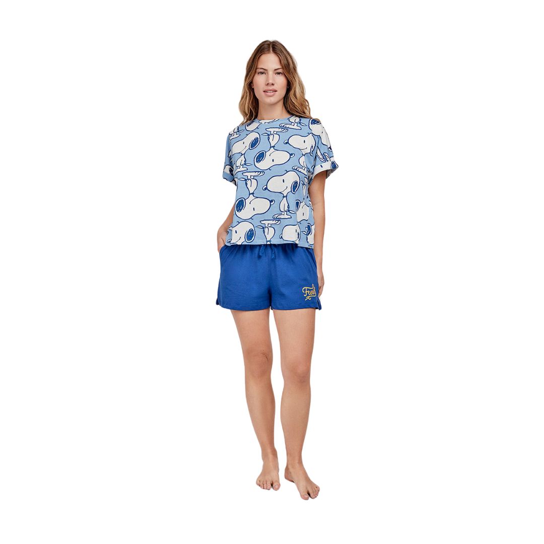 Δροσερή και άνετη, καλοκαιρινή πιτζάμα. Η μπλούζα έχει στρόγγυλο λαιμό και ρεγκλάν κοντό μανίκι. Είναι σε φαρδιά ίσια γραμμή και το ύφασμά της έχει σε όλη την επιφάνειά του την φιγούρα του Snoopy. Το παντελόνι είναι κοντό, μονόχρωμο με πλαϊνές τσέπες και μαλακό εσωτερικό λάστιχο στη μέση.