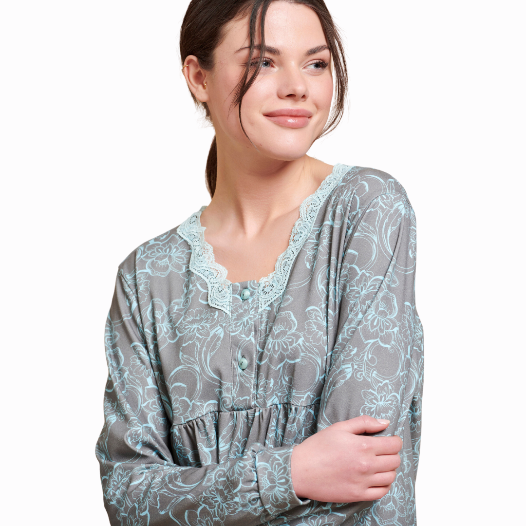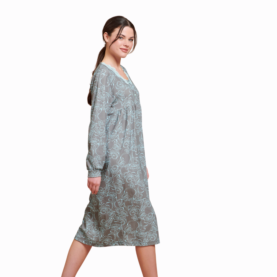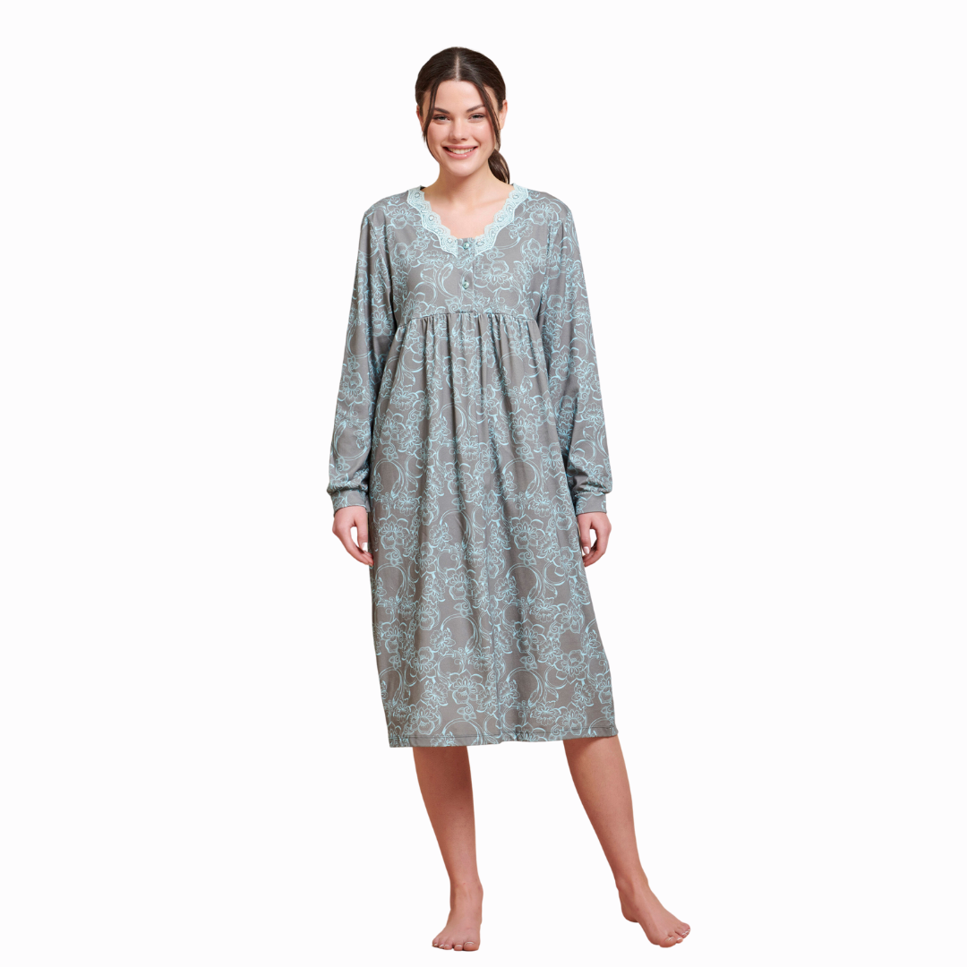 Μακρύ κλασικό νυχτικό, με μικρό V άνοιγμα στο λαιμό, στολισμένο με λεπτή φίνα δαντέλα. Έχει δυο κουμπιά μπροστά στο στήθος και μικρές πιέτες κάτω από αυτά, που δίνουν άνεση στην περιοχή της κοιλιάς και κίνηση στο ρούχο. Στις μανσέτες υπάρχει κουμπί.