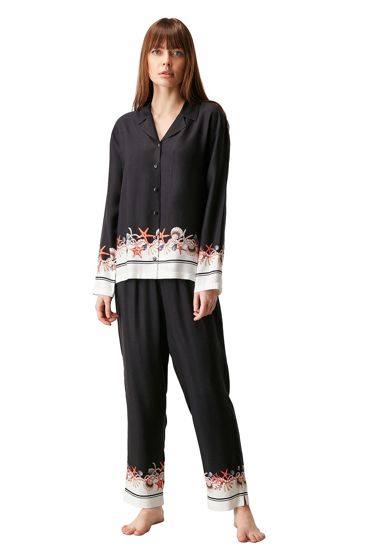 Γυναικεία πιτζάμα 100% σταθερή viscose, δροσερή και απαλή. Η μπλούζα είναι κουμπωτή με γιακά και φαρδιά γραμμή. Το παντελόνι έχει εσωτερικό λάστιχο στη μέση και ψηλό καβάλο. Είναι σε φαρδιά γραμμή.