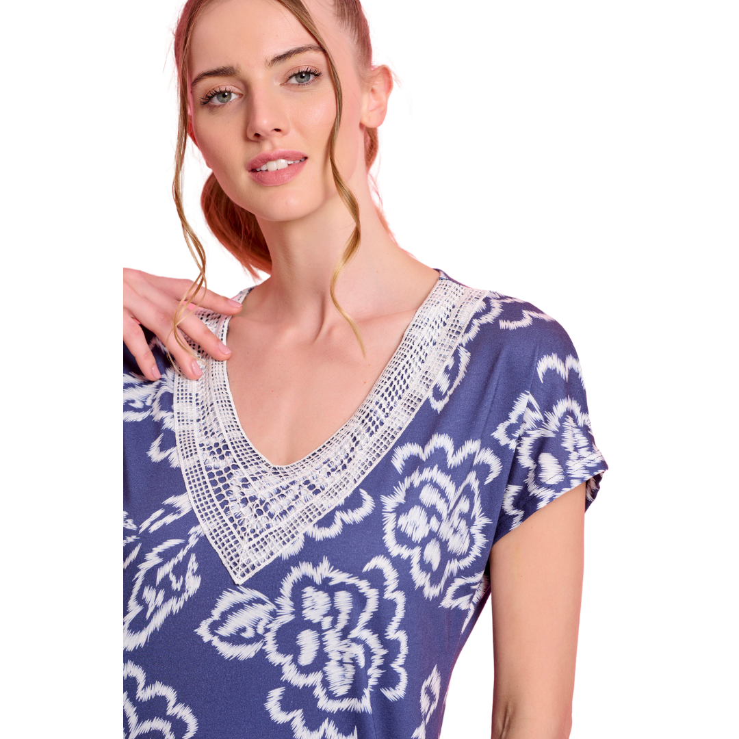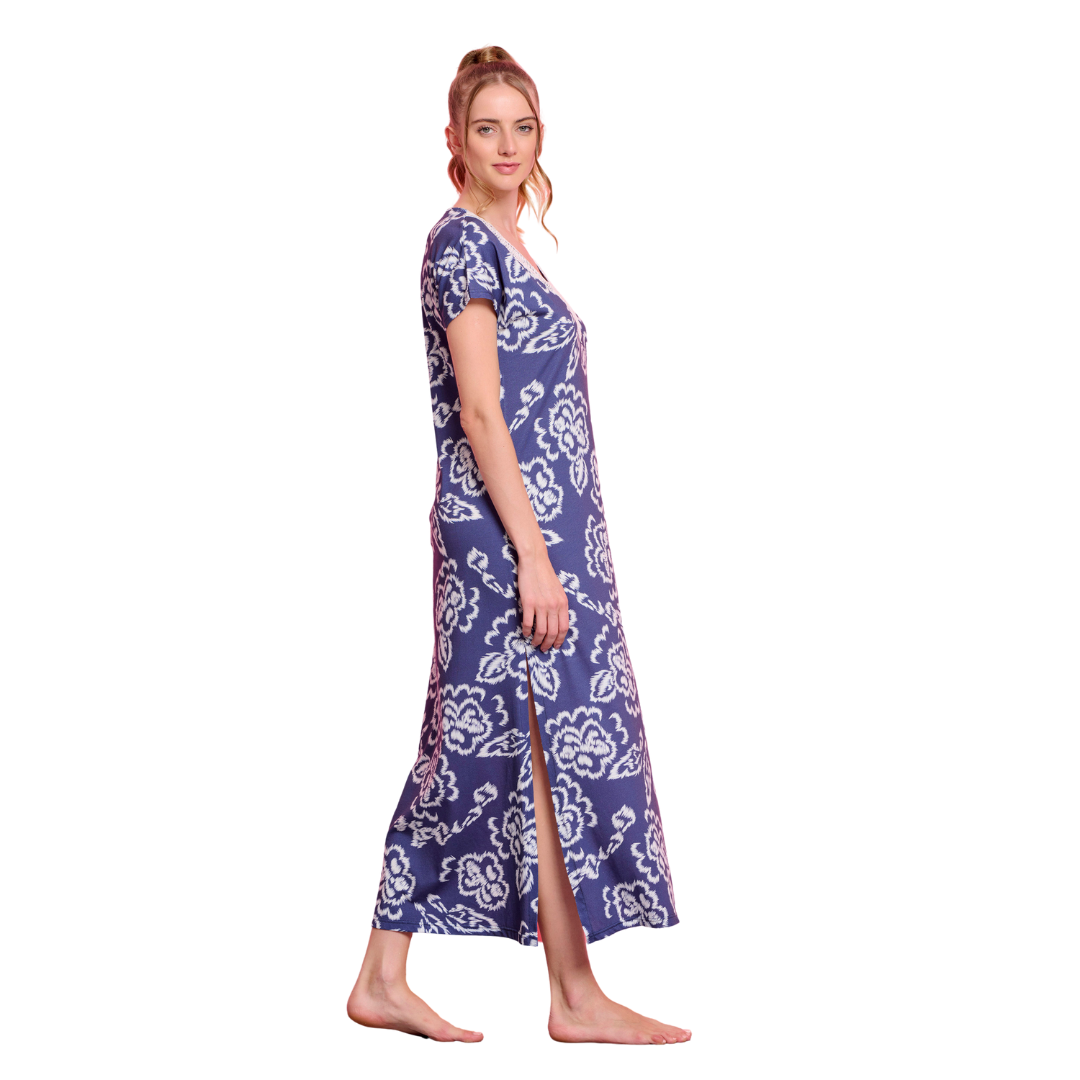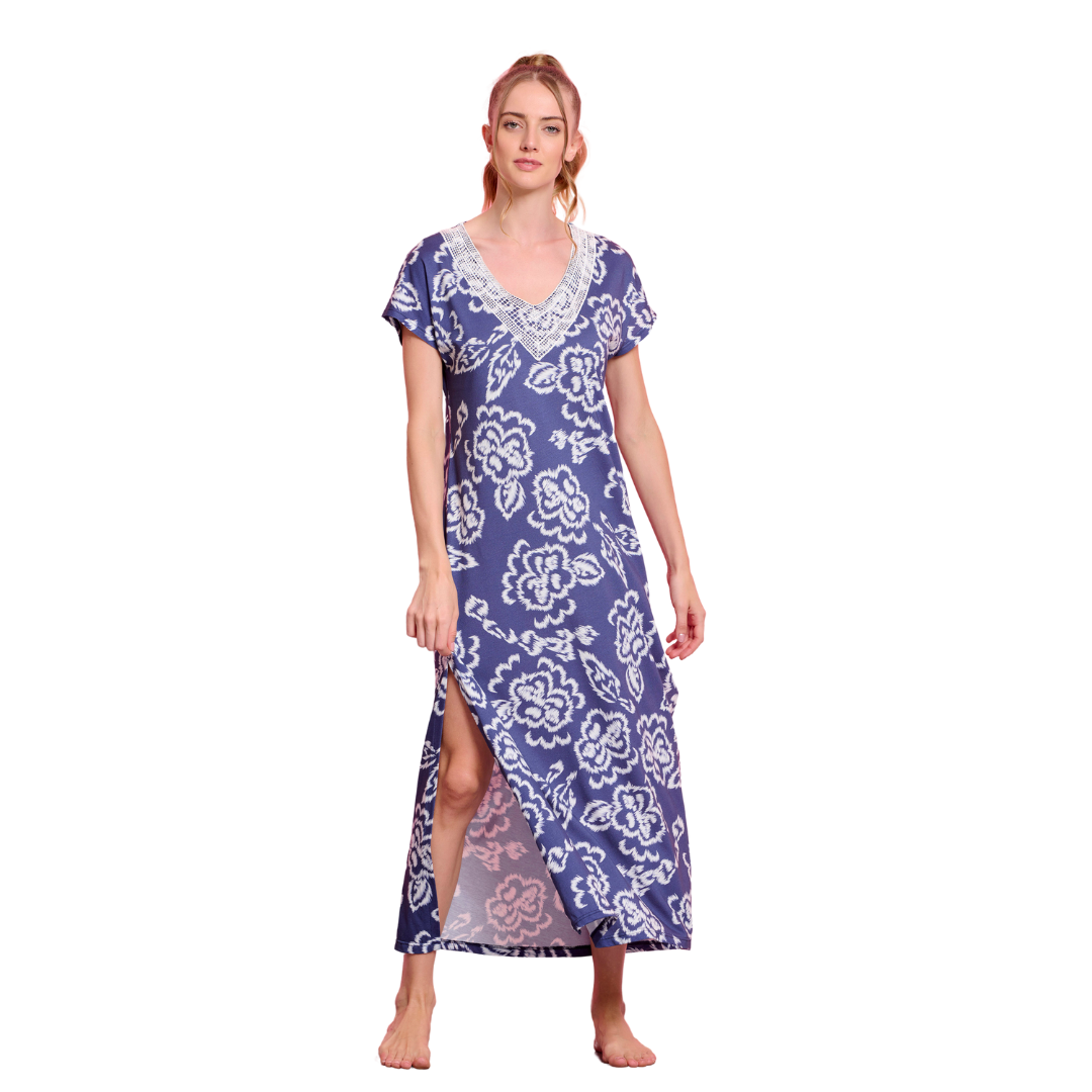 Μακρύ φόρεμα με ρεγκλάν μανίκι και V λαιμό. Είναι ριχτό και αέρινο, δεν κολλάει στο σώμα. Έχει άνοιγμα στο τελείωμα για άνεση στο περπάτημα. Το ντεκολτέ είναι στολισμένο με δαντέλα.