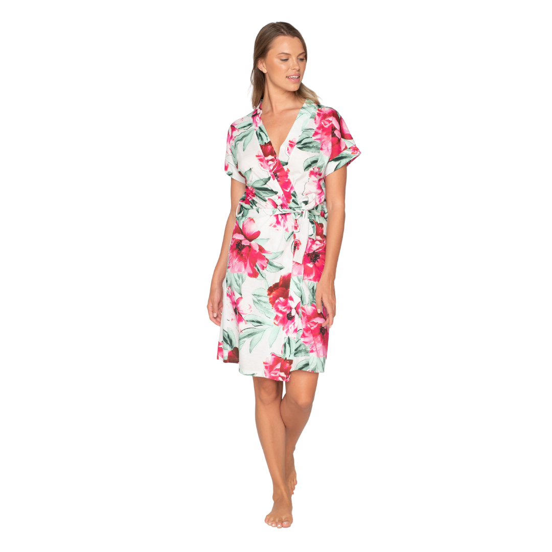 Floral καλοκαιρινή ρόμπα με κοντό μανίκι. Απαλή και δροσερή. Δένει στην μέση με ζώνη. Συνδυάστε την με την νυχτικιά της σειράς της 7042.