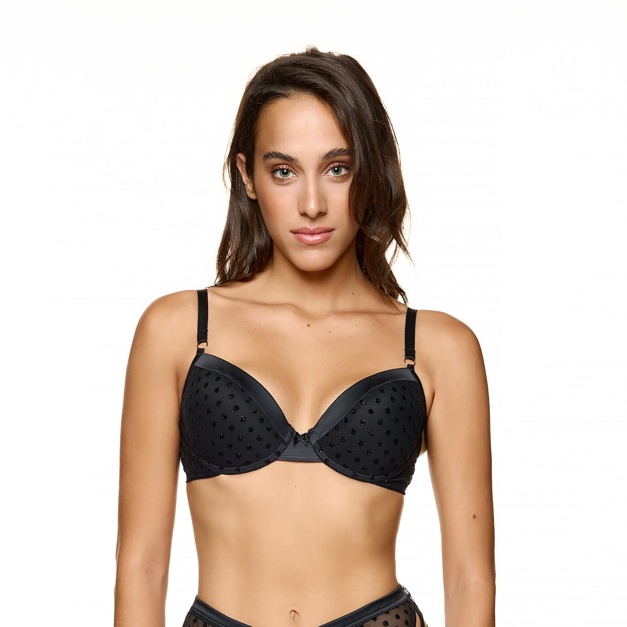 Σουτιέν με επένδυση push up, ρυθμιζόμενες τιράντες και 4 θέσεις κουμπώματος στην πλάτη. Είναι ντυμένο με πουά τούλι και σατέν λεπτομέρειες.