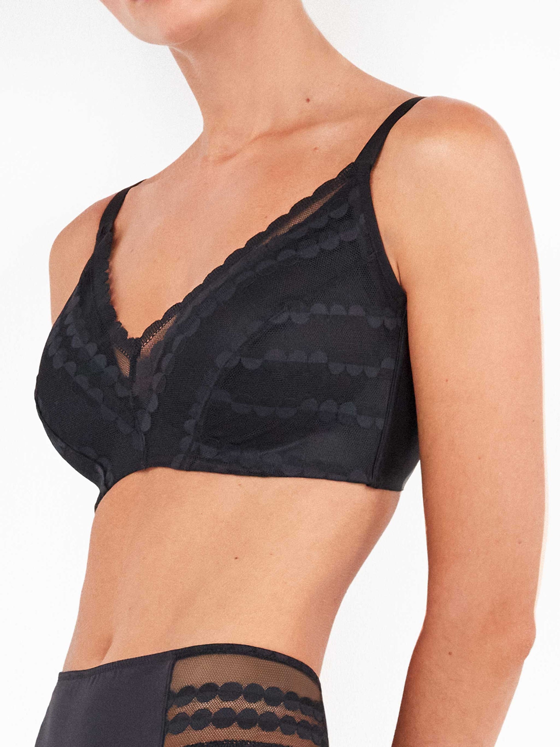 Σουτιέν χωρίς μπανέλα, με ελαφριά επένδυση στις cups και στολισμένες με δαντέλα. Έχει ρυθμιζόμενες τιράντες και 4 θέσεις κουμπώματος στην πλάτη. Η πλάτη δεν έχει ραφές, ενώ οι πλαϊνές μπανέλες βοηθάνε να μην απλώνεται το στήθος κάτω από το στήθος.