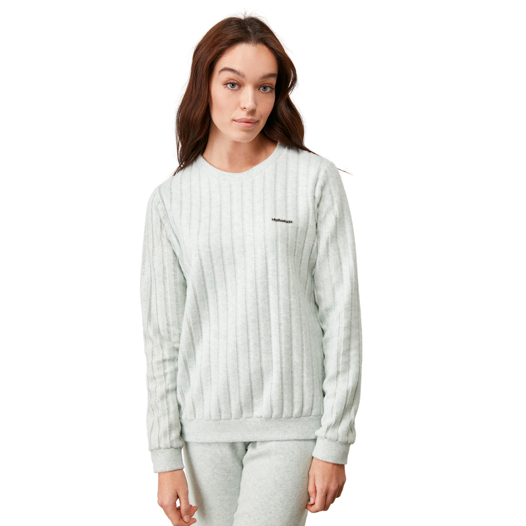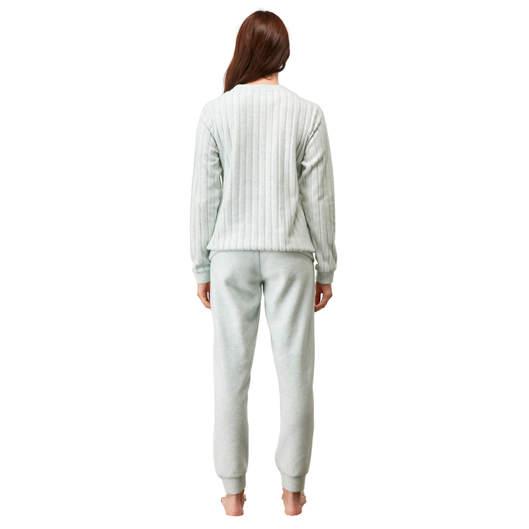 Γυναικεία πιτζάμα απαλή, με μοντέρνο σχεδιασμό και ζεστή. Είναι κατασκευασμένη από βαμβάκι εσωτερικά και λεπτό fleece εξωτερικά, έτσι ώστε να είναι φιλική προς το δέρμα αλλά και ζεστή ταυτόχρονα. Η μπλούζα έχει στρογγυλό λαιμό, μανσέτες και μπάσκα, ενώ η ύφανσή της είναι ανάγλυφη με φαρδιά ρίγα. Το παντελόνι έχει φαρδύ εσωτερικό λάστιχο στη μέση, ψηλό καβάλο και μπάσκα στο τελείωμα.