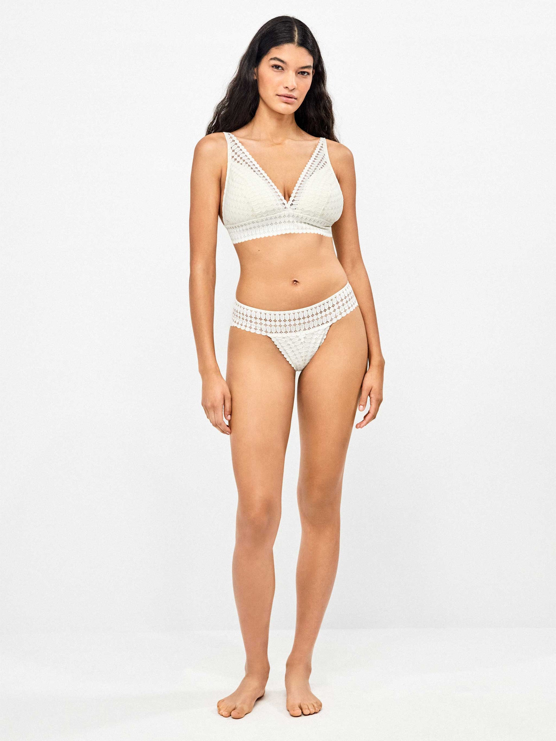 Σουτιέν χωρίς μπανέλα με ελαφριά επένδυση που μπορεί να αφαιρεθεί και πολύ καλή εφαρμογή σε μεγάλο στήθος. Χάρη στην κατασκευή του μαζεύει το στήθος από το πλάι και η φαρδιά δαντέλα στην περίμετρο του στήθους χαρίζει στήριξη. Έχει ρυθμιζόμενες τιράντες και 4 θέσεις κουμπώματος στην πλάτη. Είναι στολισμένο με κηπούρ, απαλή δαντέλα.