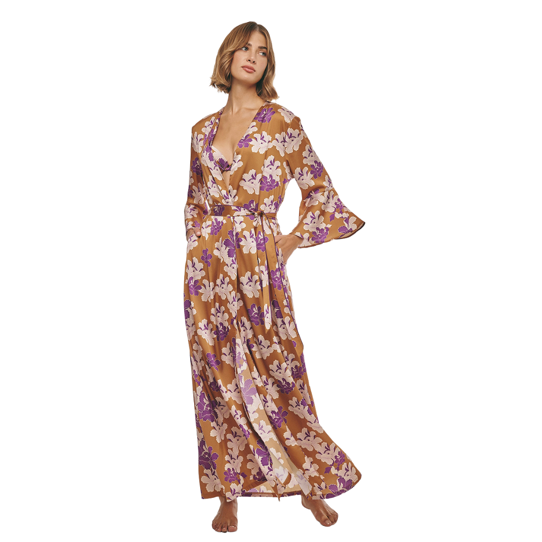 Μακριά σατέν ρόμπα με 3/4 μανίκια και φαρδύ βολάν στο τελείωμά τους. Έχει κρυφές πλαϊνές τσέπες και ζώνη που δένει στη μέση. Κατασκευασμένη από ματ satin έχει υπέροχη αίσθηση στο δέρμα.