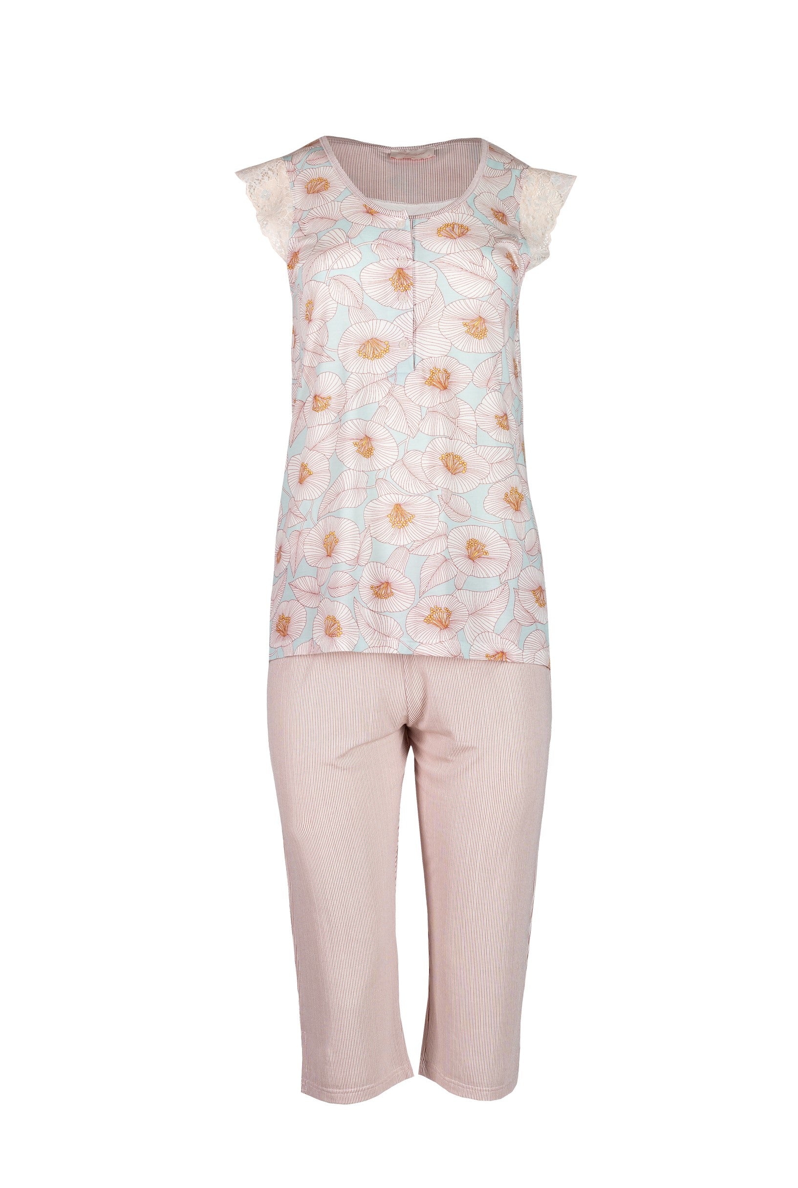 Πιτζάμα με κάπρι παντελόνι και μπλούζα με κοντό μανίκι από λεπτή και απαλή δαντέλα. Διαθέτει 4 κουμπιά μπροστά.